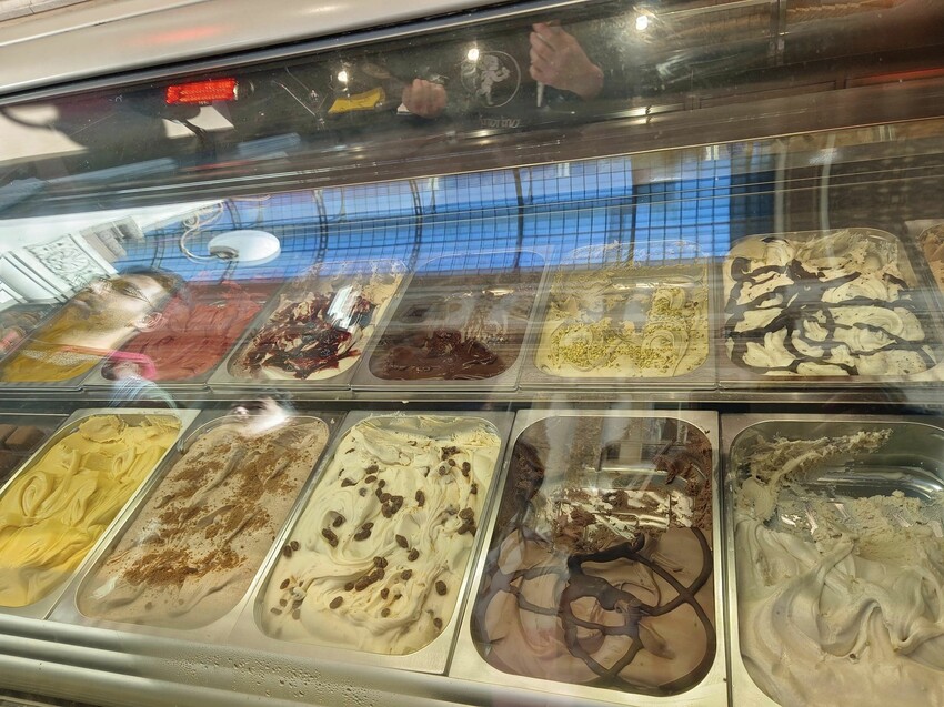 冰櫃內的冰淇淋口味相當多元,又到了我們天秤座選擇困難的時候,每種都好想吃,但可惜口袋和胃袋都容量有限,不過義大利冰淇淋必嘗的就是開心果口味,別處還不見的吃得到,上排右邊數來第二個,淺綠色還撒著碎果粒的就是開心果冰淇淋,我立馬決定就是它了!