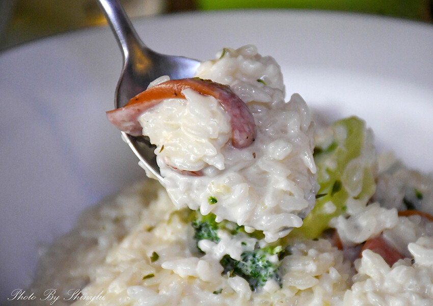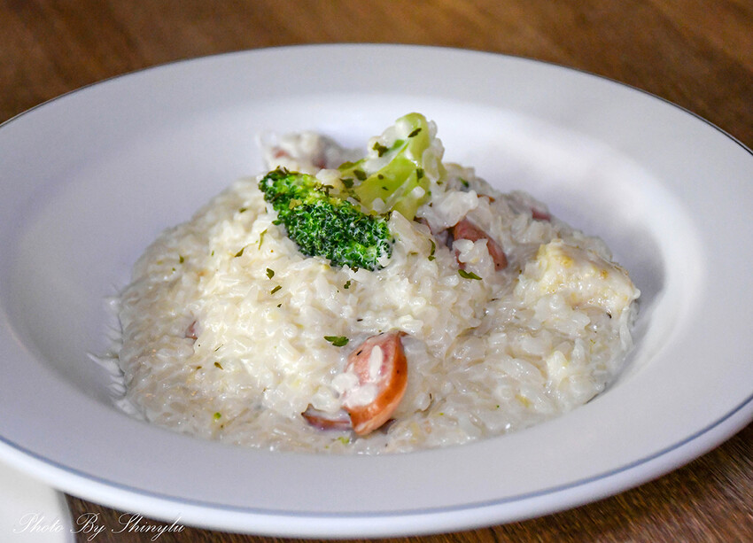 奶香豐富又濃郁,燉飯粒粒飽滿很有味道,口感鹹香很涮嘴,配料除了德式香腸、還有綠花椰菜,吃完很有飽足感