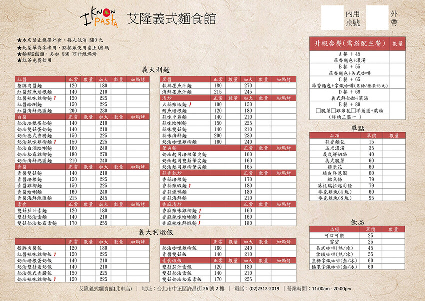 附上菜單給大家參考,義大利麵就有紅醬、青醬、黑醬、清炒…等多種選擇,燉飯的口味也很多,價格都不貴
