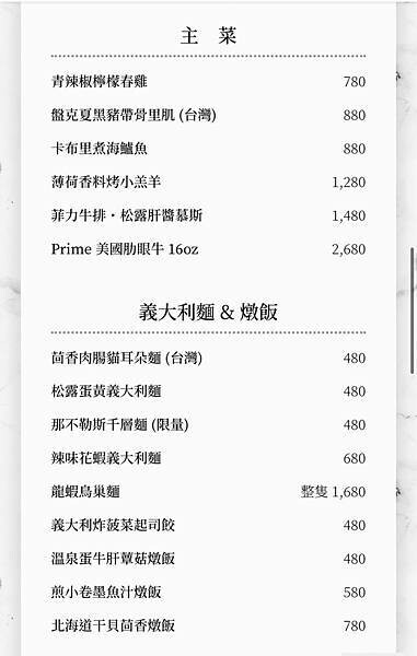 餐點種類有:前菜、熱湯、主菜、義大利麵&燉飯、披薩、甜點,