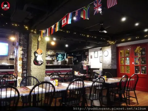這家店位於市中心,裝潢極具美式風情,牆壁上放滿了各種漢堡車模型。