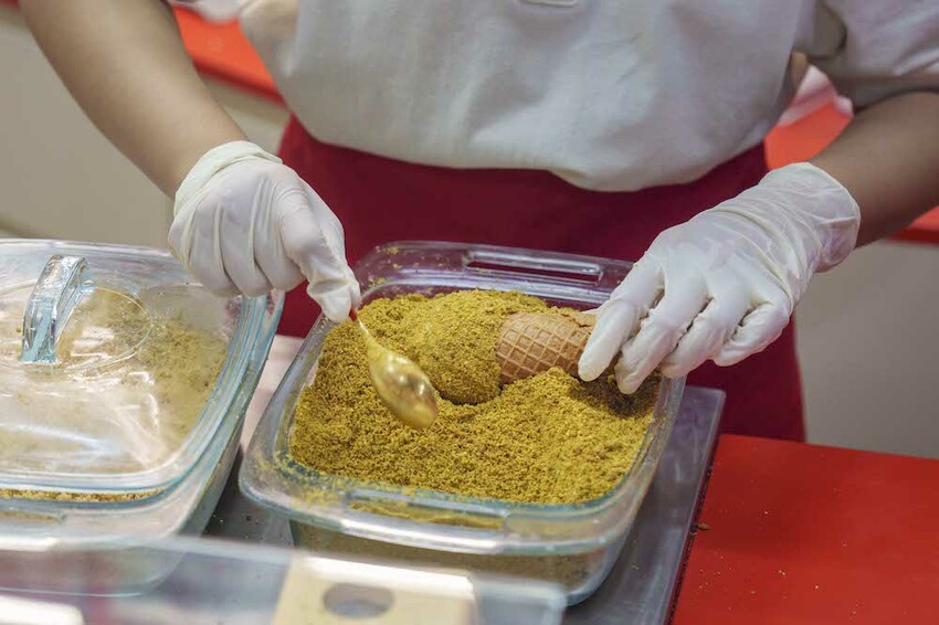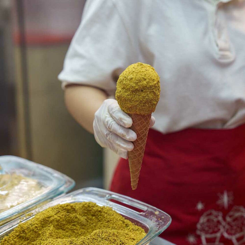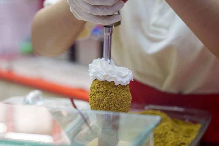 並且有多達10種口味,其中最特別的就是在錐形的甜筒冰淇淋上捲滿厚厚一層開心果的口味