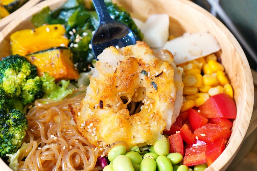 海鮮控最愛的蝦貝三重奏波奇碗,除了大塊紮實的舒肥雞胸肉,還包含了緊實的鳳尾蝦,以及細緻彈牙的珠貝;魚編大推可以搭配異國海南雞醬,迷人的檸檬清香,更能襯托出海鮮的甜味!