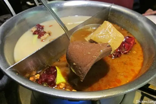 我們這次點了四人套餐選擇了鴛鴦鍋,一邊是他們的麻辣鍋,一邊就是老火湯鍋,這邊一定要稱讚一下,在店內用餐的話麻辣鍋可以無限加底料,豆腐跟鴨血都非常好吃,而且都很入味。