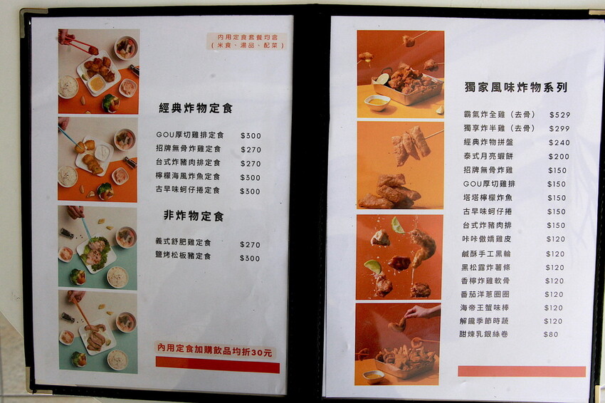 這本厚厚菜單供顧客點餐參考,菜單主要有經典炸物定食、非炸物定食、獨家風味炸物系列、咖啡類、茶類及外帶餐盒等,整體菜單品項很多定價很親民。