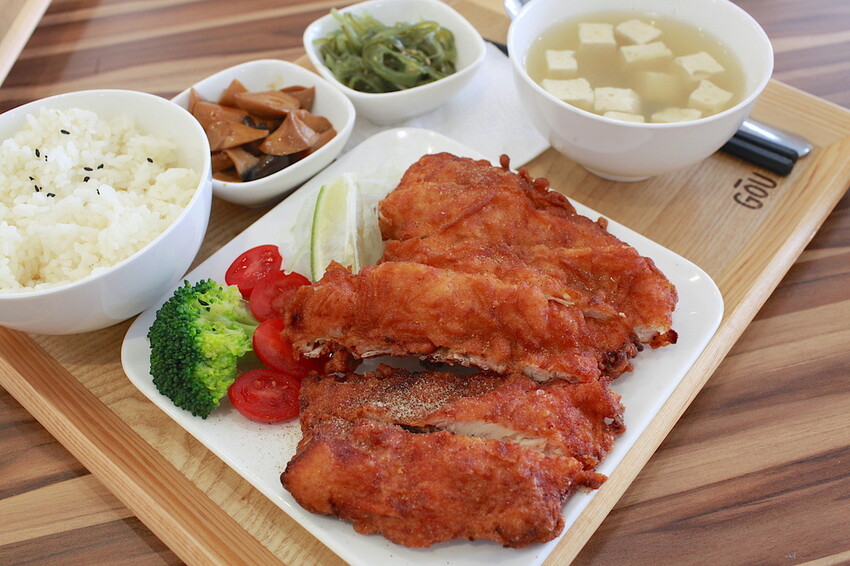 這是Gou厚切雞排定食300元,定食套餐就增白飯、2樣小菜及一碗味增湯等,這樣套餐小高認為較像是日式定食才對。