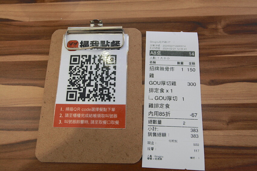 小高就選Gou厚切雞排定食300元與招牌無骨炸雞150元,現在慶開放85折優惠因此收取383元。
