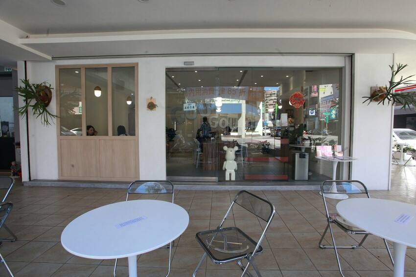 兩邊騎樓下都有放置桌椅供顧客坐下用餐,大片落地窗就可以直視裡面情景。