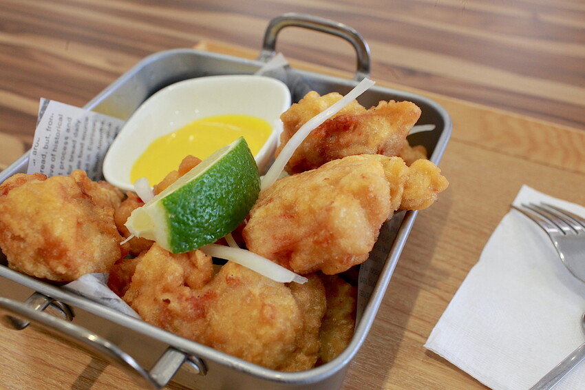 這盤無骨炸雞份量多定價150元真便宜,炸雞切很大塊裹上厚實麵衣油炸,有附上洋蔥絲、檸檬片及芥末醬來搭配享用。
