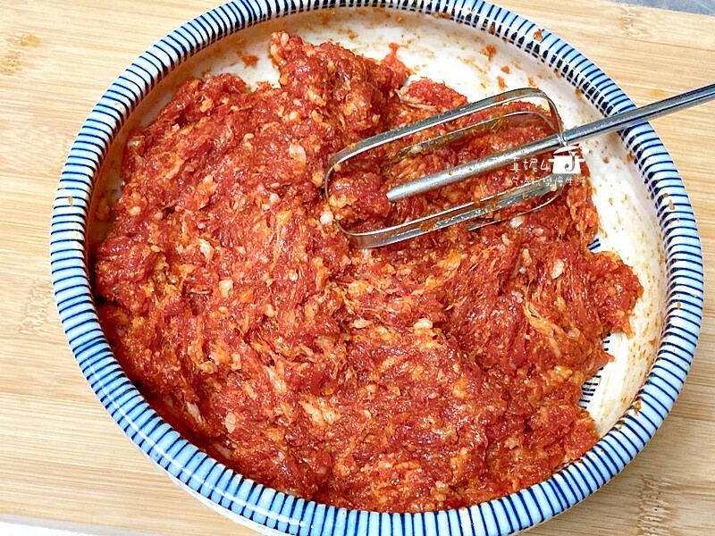 2.加入所有調味料,先用刮刀拌勻再用攪拌器抽打到肉質有毛邊的黏稠感