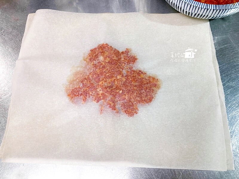 把前一份當上被的烘焙紙鋪底後當下一片的底紙,放另一半肉餡,這回用保鮮膜當上被,一樣用雙手輕輕把肉餡推平