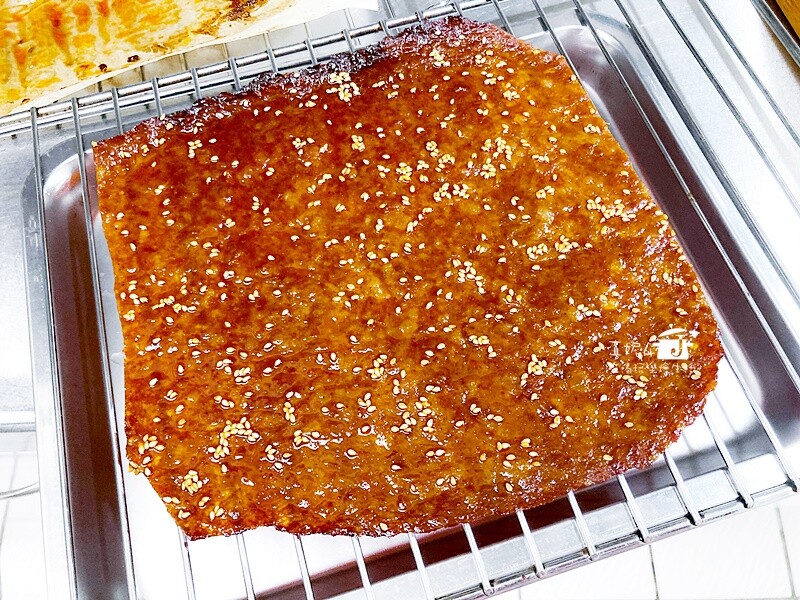 烤熟的豬肉乾放在網架上降溫後剪成方便入口的小塊,絞肉沒有粗顆粒嚼起來並不費勁