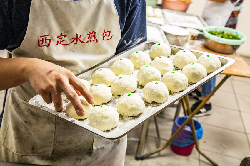 包完的水煎包直接拿到前面的煎台煎,一顆顆飽滿的水煎包整齊放進圓形的大煎盤裡,西定水煎包是以半煎炸的做法,所以外皮吃起來會帶有酥脆感跟香氣