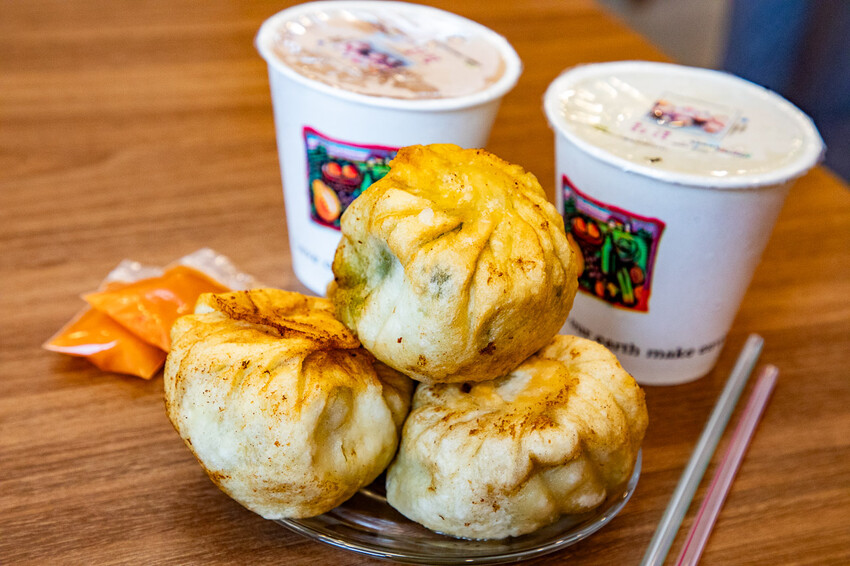 招牌水煎包以新鮮高麗菜與豬肉餡,半煎半油炸,呈現金黃酥脆外皮,皮薄餡多的水煎包,高麗菜餡滿而調味適中,味道清爽,結合麵皮與菜的甜香,裡面的肉餡是用獨門配方炒製才包入煎包中,所以肉香氣很足夠又多汁