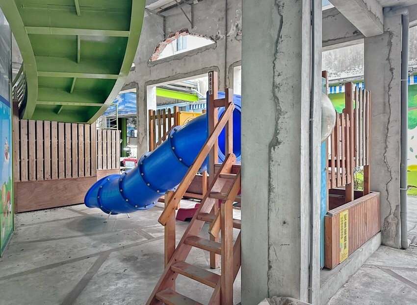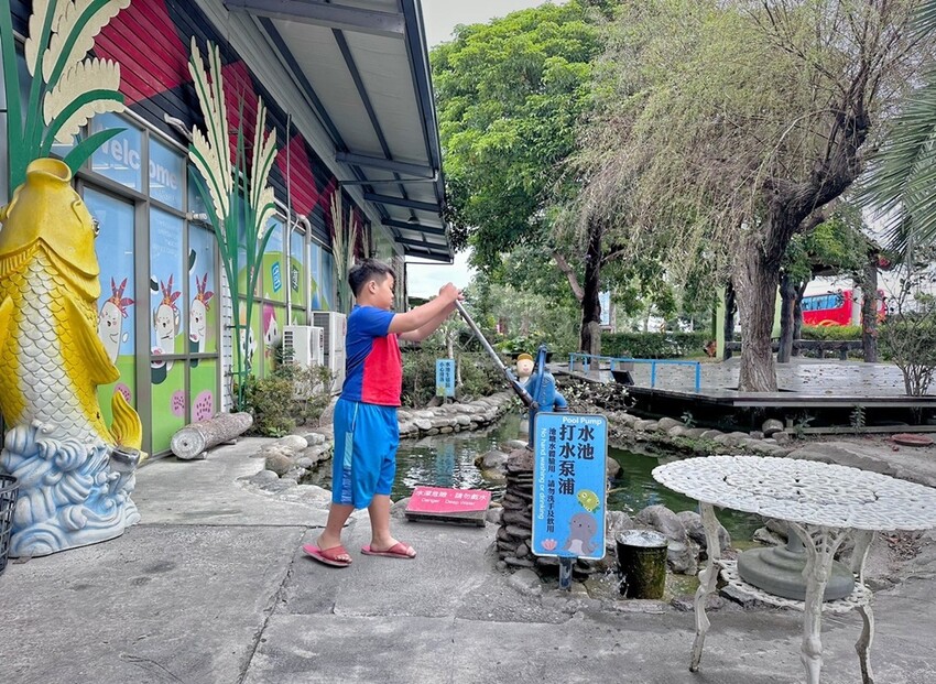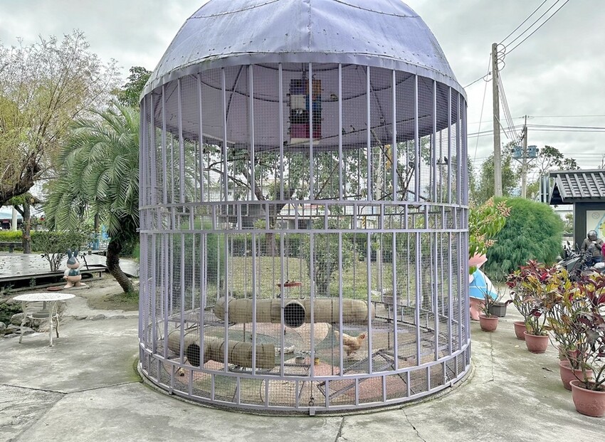 往廠區的方向走去可看到室內的兒童溜滑梯;而在農會展售區門口旁也有小魚池、鳥籠可近距離的欣賞鳥兒們及餵魚喔!