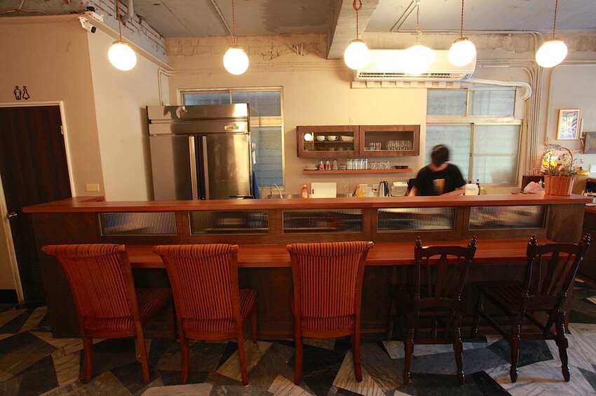 室內用餐空間盡可能維持老宅原始的面貌,添加元素馬克磚跟復古吊燈來增加風采。