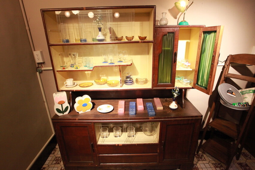 這老舊壁櫥跟櫃子有陳列商品供客人欣賞。