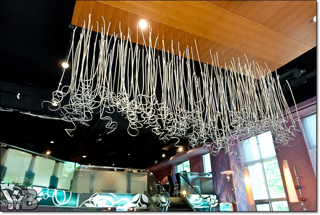 天花板中間吊掛的裝置藝術還挺有後現代簡約的風格~