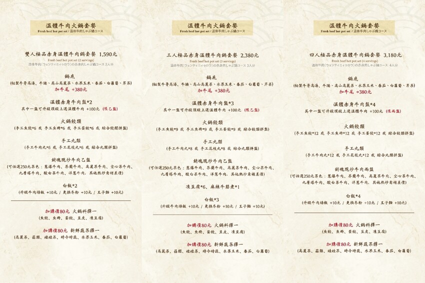 宣牛溫體牛肉火鍋有2人、3人及4人的套餐選擇,從鍋底、溫體牛、熱炒、火鍋配料到白飯,都有不同組合的搭配。大概均消1000/人,就可以吃很飽。