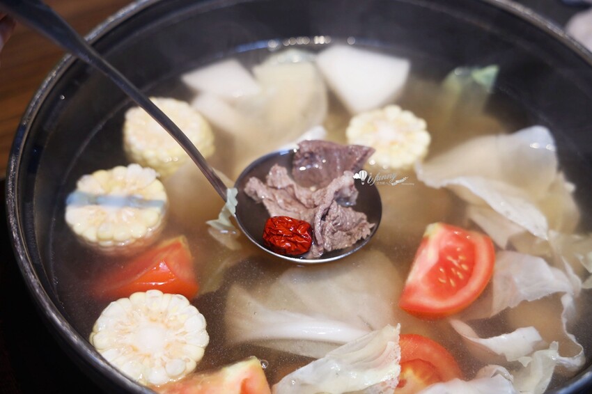 湯底內已經有一些蔬菜,像是高山高麗菜、蕃茄、白蘿蔔、芹菜以及水果玉米,還有不少塊的牛腩,口感相當Q彈。湯頭上還有些紅棗。因為加了大量牛骨及多種蔬果熬煮,所以入口鮮甜超好喝!雖說是與「阿財牛肉湯」聯名合作,但感覺不偌台南印象中那麼甜。