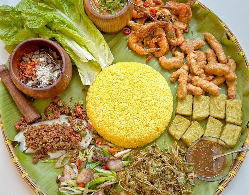 拍照打卡很壯觀的傣族手抓飯,內有泰北三香牛、傣味涼拌鮮茄、香檸生態白蝦、昆明酥肉、酥炸碗豆粉、酥炸野菜、雲式臘腸、豆鼓鱈魚等組合,中間的主食則是黃薑飯;泰北三香牛、傣味涼拌鮮茄可包生菜享用,昆明酥肉、酥炸碗豆粉、酥炸野菜沾著店家特調醬汁還挺不錯。但真心說這份餐點適合在圓桌上享用,坐在方桌享用這道餐點,挺不方便,因為端上桌後就滿!