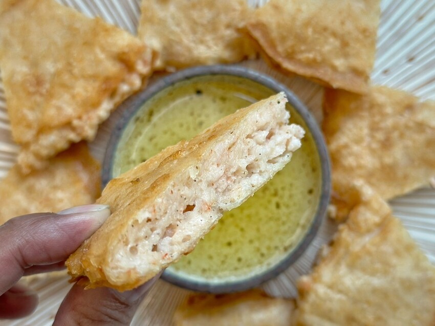 月亮蝦餅是用白蝦打泥作餡,鋪上餅皮後再炸的金黃酥脆,但味道有點偏鹹,提供的醬料,我們沒有很喜歡,因為我們都比較喜歡泰式酸辣醬。