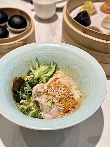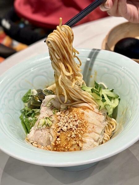 搭配鮮嫩的口水雞、皮蛋、黃瓜絲拌勻後,