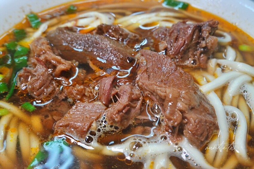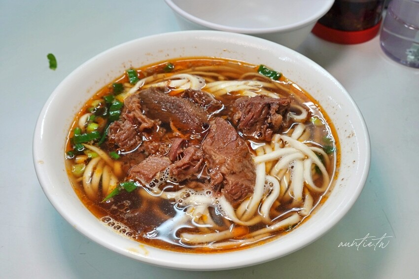 其實品項不多,牛肉麵分成紅燒與清燉口味,再來就是豬腳麵,小菜泡菜賣光沒得吃,不然就是單點豬腳,想說還要再去旁邊吃三味麵食的餛飩跟排骨,就點了一碗紅燒牛肉麵試試口味,點紅燒湯頭還可以選擇油少一點、清淡一點喔,聽到不少阿姨點餐時都會講油少、麵軟,連麵的口感都可以客製。