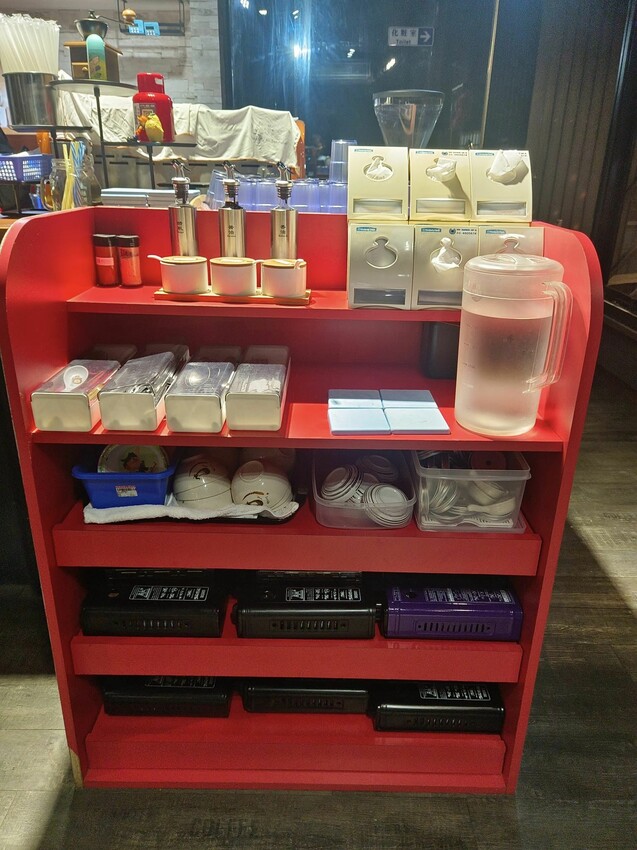 櫃檯前有醬料和餐具自取區,想喝開水自己倒,下面則是吃火鍋用的小瓦斯爐