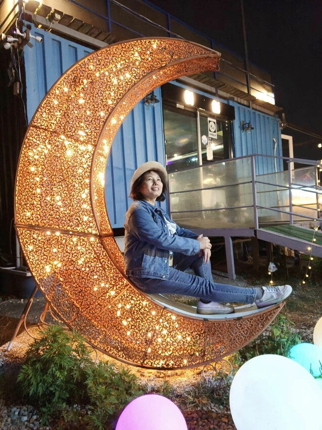 現在就來示範怎麼跟下弦月合照,因為本人腿短,剛好可以跟小天使一樣坐在月亮的弧度裡,如果是落咖A來,估計無法坐得這麼剛好🤭