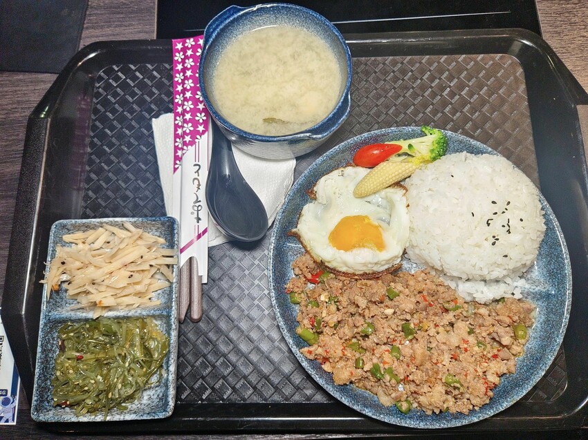 我點了這份泰式打拋豬定食$320,除了主食還有二碟小菜和味增湯
