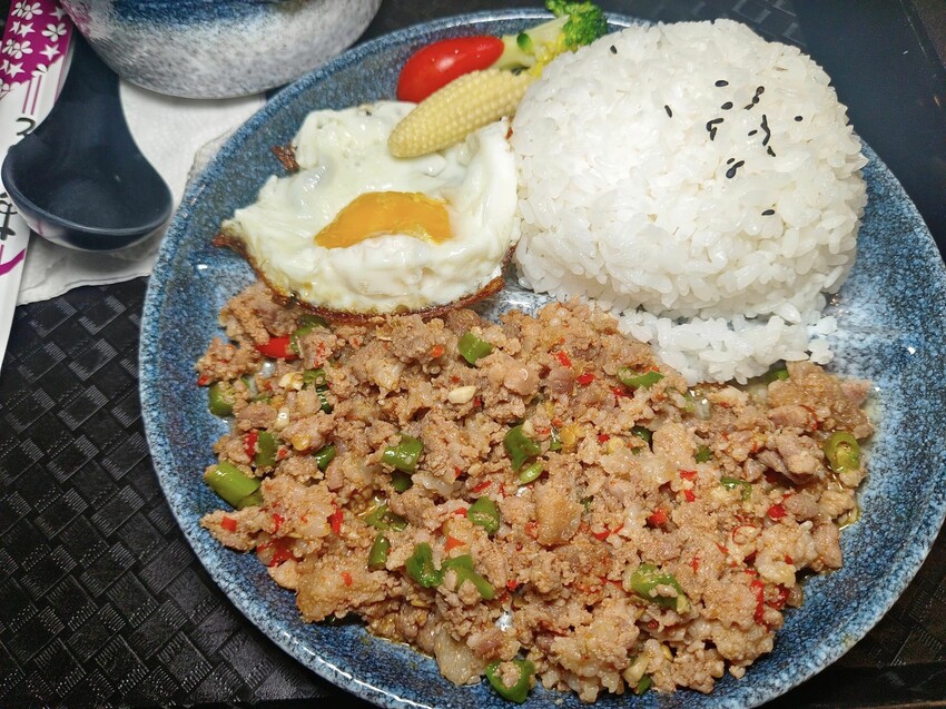 泰式打拋豬帶點微辣的口感很下飯,旁邊搭配一顆半熟荷包蛋更加分,吃得我們都頻頻點頭