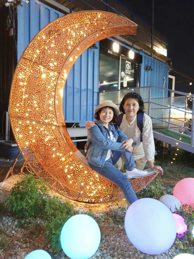 餐廳門口的布置很吸睛,除了一彎下弦月,草地上還滾落幾個彩色光球,也是很多人喜歡拍照打卡的地點