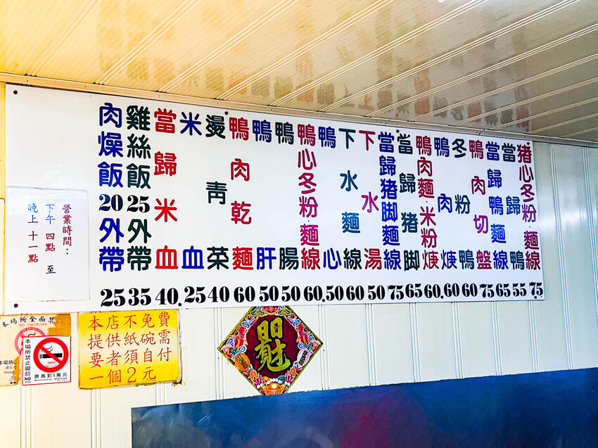 嘉展當歸鴨價目表如下,價位不會很貴,主要是以鴨肉料理為主,很多台南在地朋友跟我說,一定要點它的鴨肉焿,超特別外面吃不到的口味,一吃絕對會驚訝的那種,然後我看到肉燥飯跟雞絲飯內用跟外帶不同價,不知道為什麼?大概是紙碗的關係?