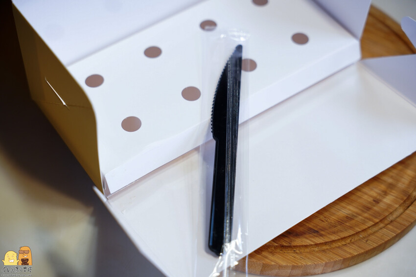蛋糕本體下方還有刻意加高,就是避免蛋糕被重摔造成變形,紙盒下方也備有一個塑膠刀,如果有買很多條的朋友,這刀子是可重複使用