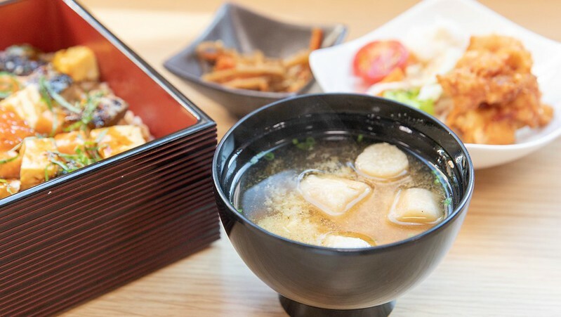 焼き鯖重定食1360日幣,定食還有附麵麩味噌湯、炸雞沙拉及醬菜。