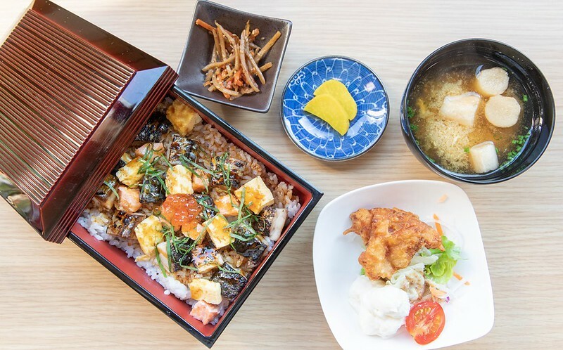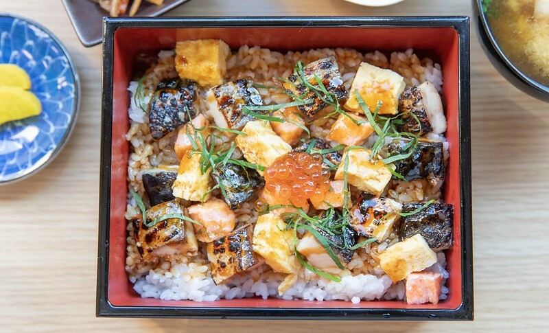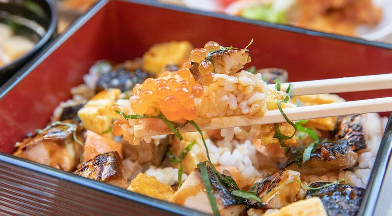 好奇查了一下這名物的由來,簡單歸納它的構想來自日本到處都吃得到的烤鯖魚和鰻魚飯,說法是若櫻是經濟不算太好的山城,不易嚐到價格比較高的鰻魚飯,於是便用鳥取容易取得,也相對便宜的鯖魚取代,加烤過的鯖魚切成丁狀,加入散壽司的元素,放在像鰻魚飯的漆器裡,便成了視覺價值大大提升的「焼き鯖重」。