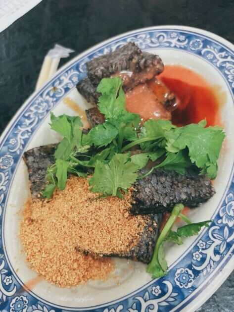 除了招牌麻油雞湯,錦州美食還提供多樣的配菜,其中以米血和燙青菜最受歡迎。米血的口感綿密,他們家的米血量大概7到8塊左右,他們調製的客製的醬汁,酸辣酸辣的口感配上甜甜的花生粉,米血糕沾這兩個料真的是非常的絕配、超級好吃!。
