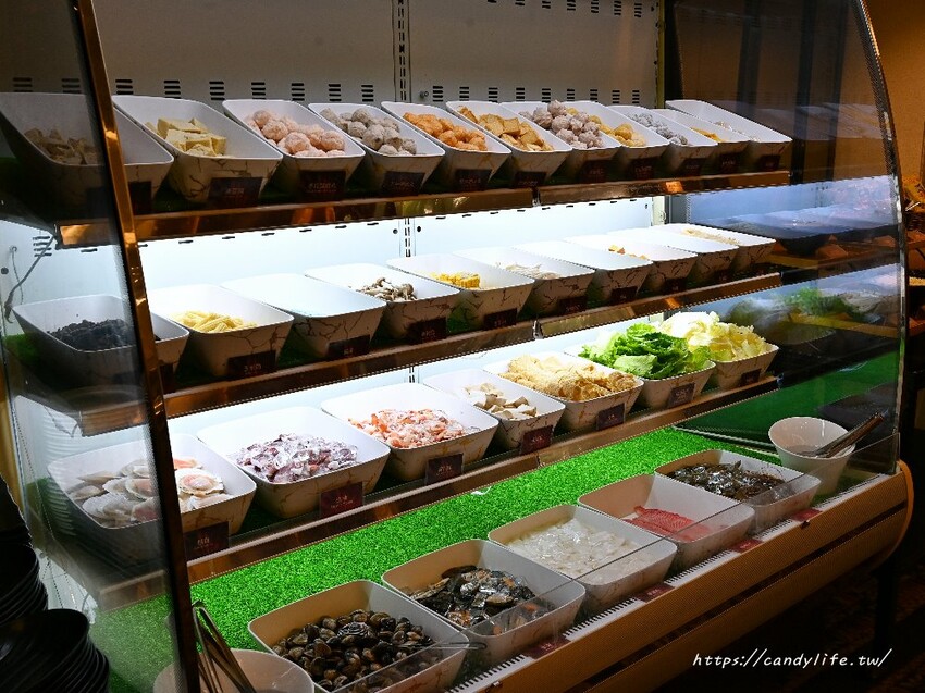 火鍋料及蔬菜也是採自助夾取,裡頭除了火鍋料、蔬菜、菇類、還有蛤蜊、扇貝、九孔、鮮蝦、鯛魚等海鮮
