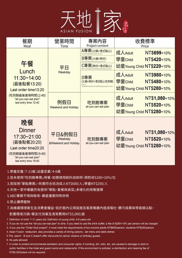 清新溫泉天地一家中餐廳平日中午是699元起加一層服務費,平日晚上及假日全天是1080元,加一層服務費