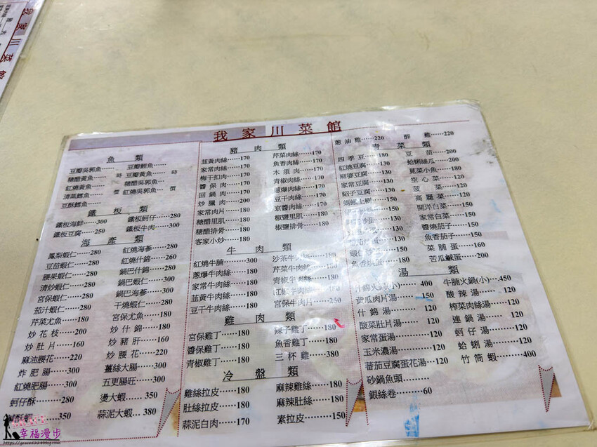 我家川菜的Menu,不是把要點的餐畫在上面,而是會有便條紙讓你把菜單寫在紙上,餐點內容有魚類、鐵板類、海產類、豬肉類、牛肉類、雞肉類、冷盤類、蔬菜類和湯類,價格看起來也不會太貴,算是很親民的川菜料理。