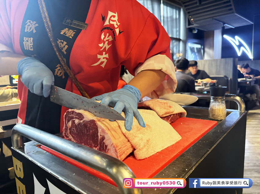 肋眼牛排。在平板點餐後就會有現切原塊牛肉桌邊的服務。