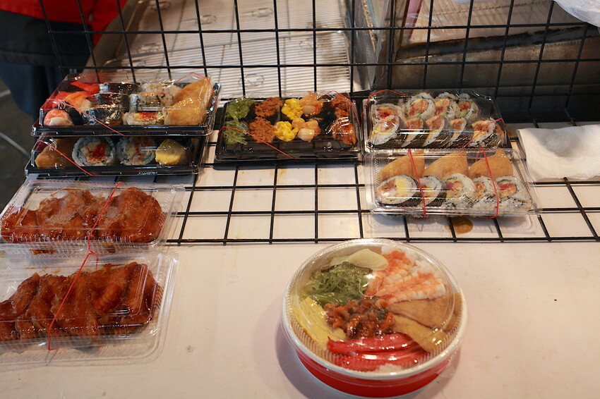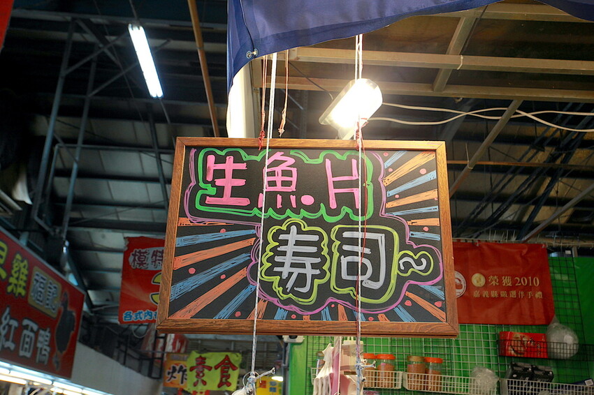 小高發現這攤位掛上很日式的扛棒跟布條,燈光明亮黑板手寫生魚皮.壽司」字眼顯眼。