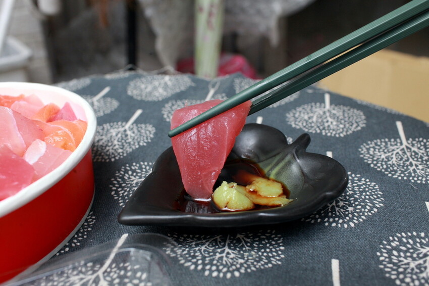 這生魚片切的厚度夠比較偏小塊些,這鮪魚甜度夠吃起來不錯吃