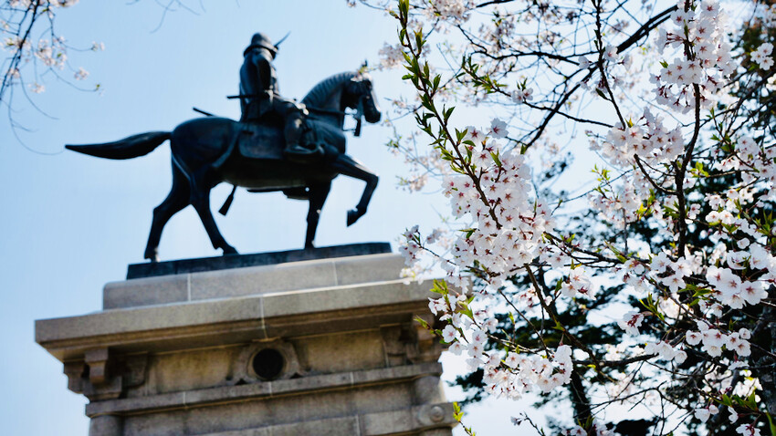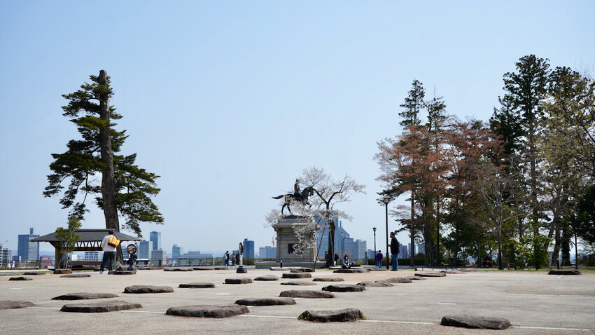 來到仙台當然一定要拍「伊達政宗騎馬像」,伊達政宗騎馬像就位在仙台城址,搭乘循環公車在BUS STOP 仙台城址站下車即可,櫻花季可以拍到櫻花與伊達政宗同框,很壯光的美景喔!
