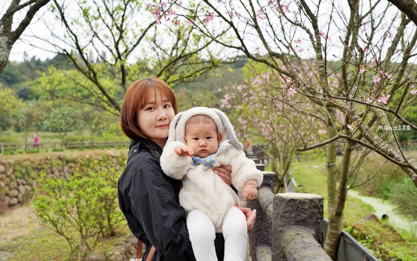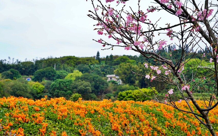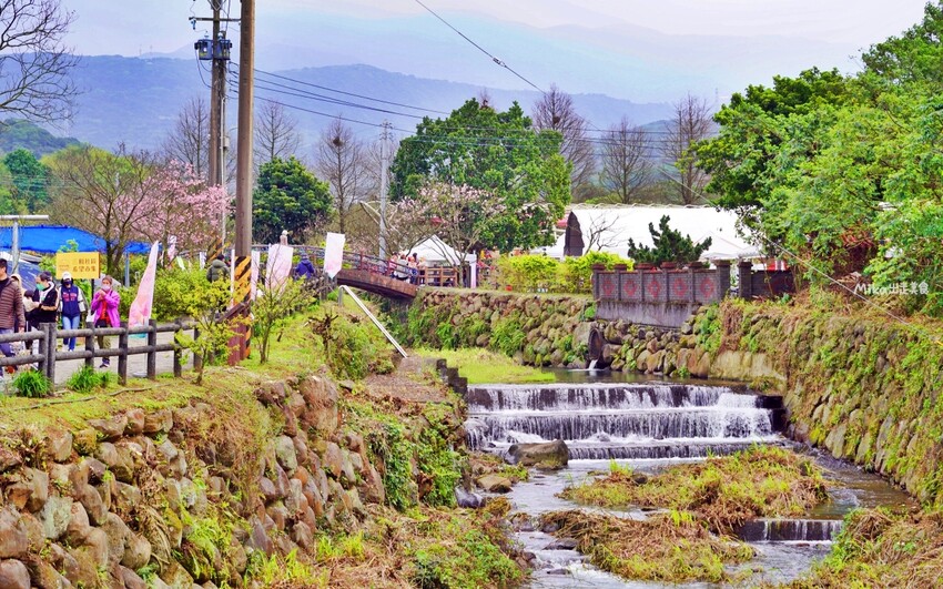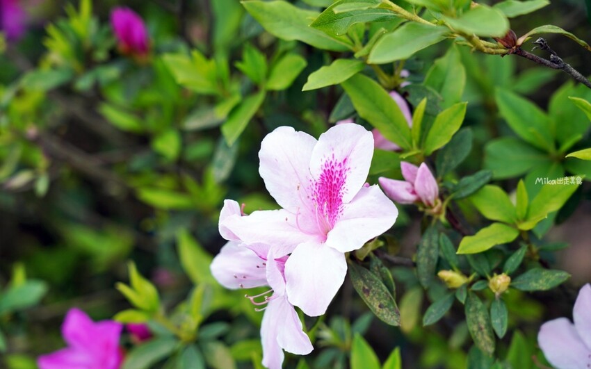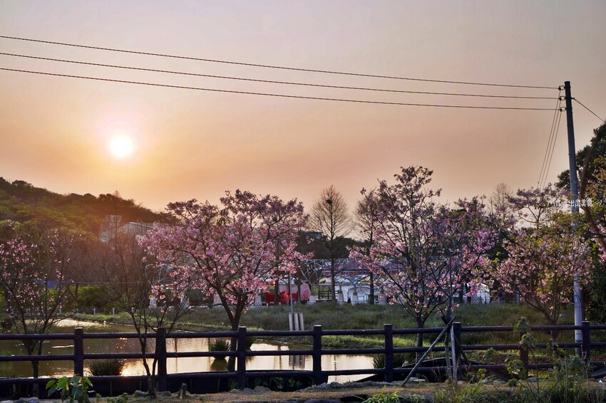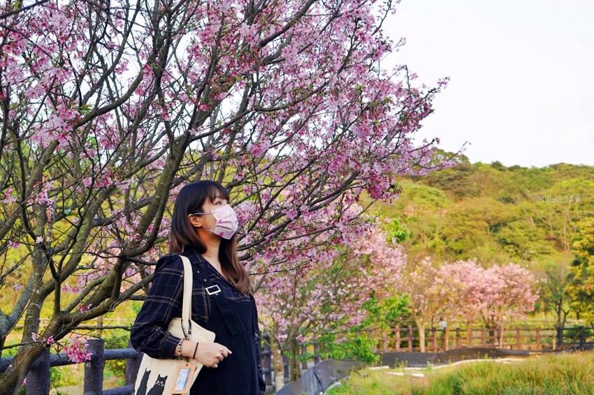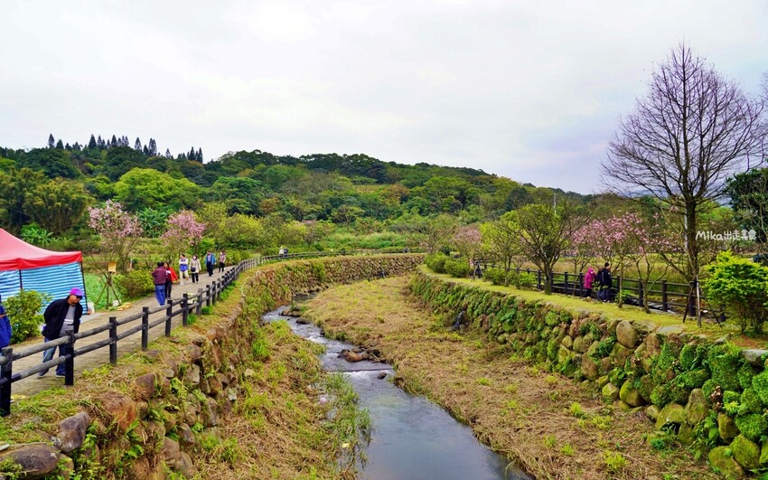 溪畔步道的綠意中夾雜了幾抹粉紅浪漫