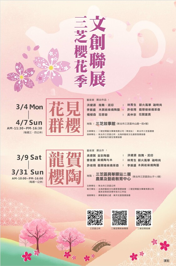 三芝這個月不但很櫻花也很藝文,從3月4日至4月7日在三芝故事館「花見群櫻文創聯展」以及從3月9日至3月31日在興華驛站的「龍賀櫻陶文創聯展」的2場展覽。
