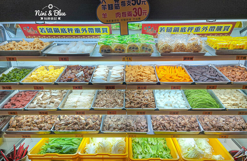 耀武羊威羊肉爐吃到飽以自助吧方式自己夾取想吃的食材,有7種羊肉部位、多種蔬菜、蕈菇類、豆腐類,也有鴨血、海帶、豆皮可以夾,也有王子麵、鍋燒麵、蒸煮麵、冬粉等主食,自助吧種類相當豐富。