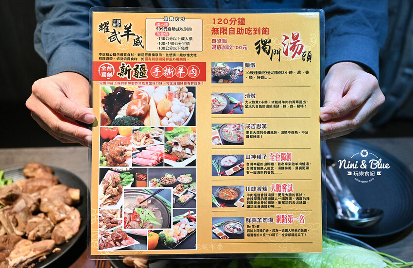 湯頭有6款:藥燉、清燉、成吉思漢、山神種子、川味香辣、鮮蒜羊肉湯,點鴛鴦鍋的話則是依每鍋湯底加收100元,不是每人加100元。不想吃到飽的也可買外帶套餐回家自己煮~