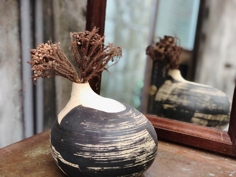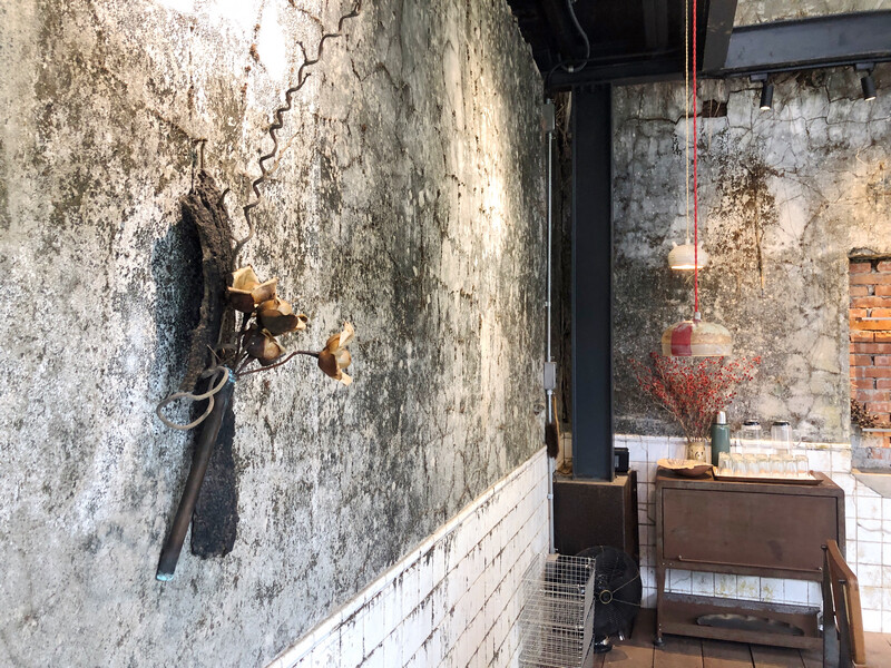 有著微裂痕的斑駁磚牆面,蘊藏著歲月所留下的痕跡。暈黃的吊燈下,幾束的乾燥花在樸實的空間裡帶來了獨特的柔和美感和自然的氛圍。